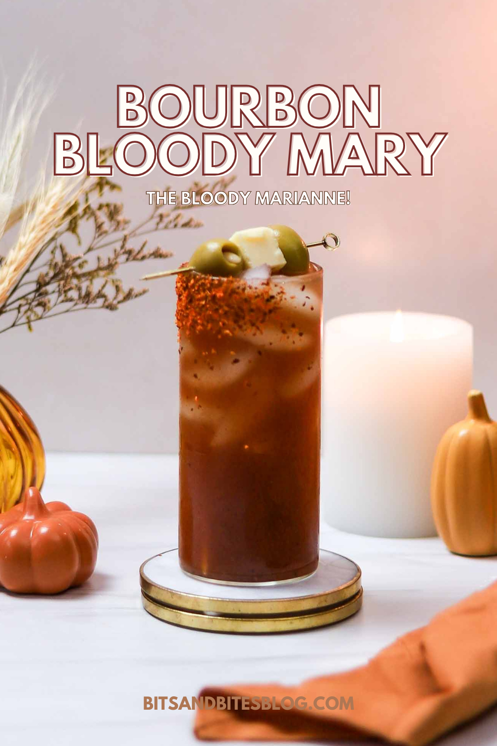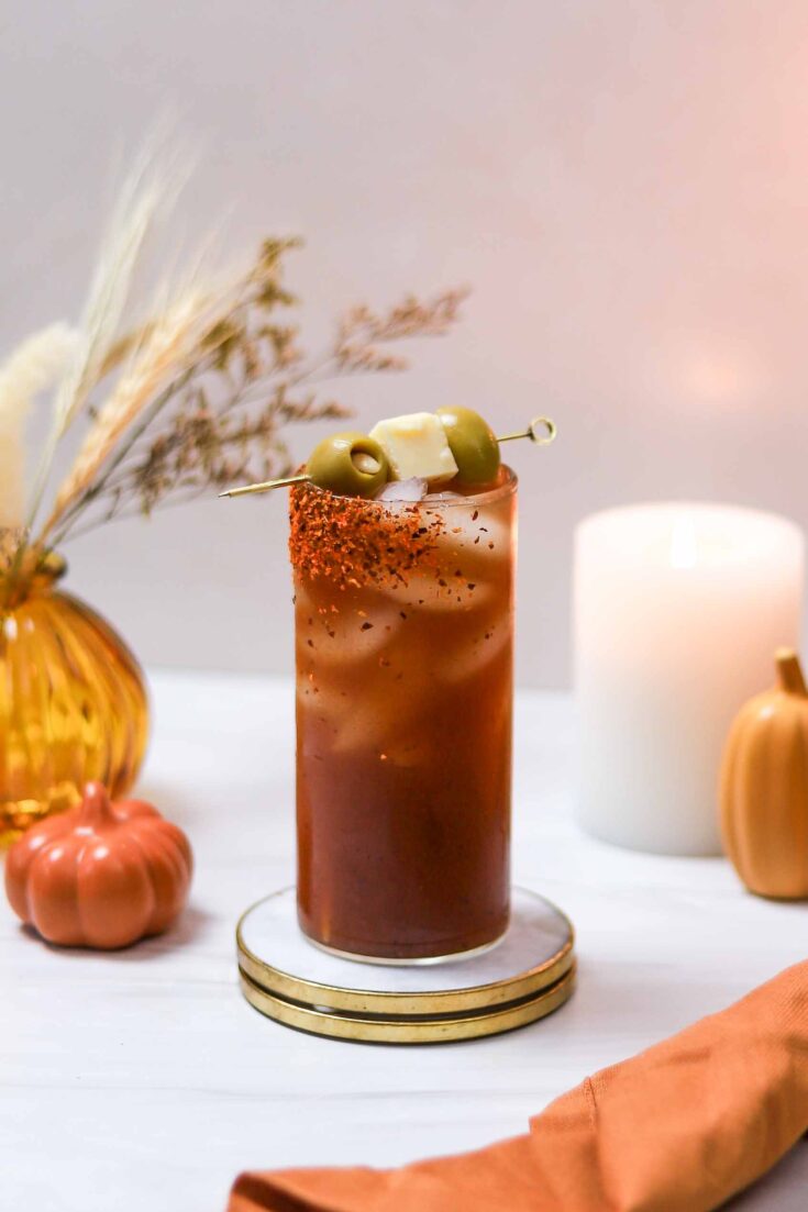 This bourbon Bloody Mary is the perfect Thanksgiving morning cocktail! While everyone else is running a Turkey Trot or playing in a Turkey Bowl, you can catch me enjoying one of these. I love how the bourbon pairs with the Bloody Mary mix and other flavors.